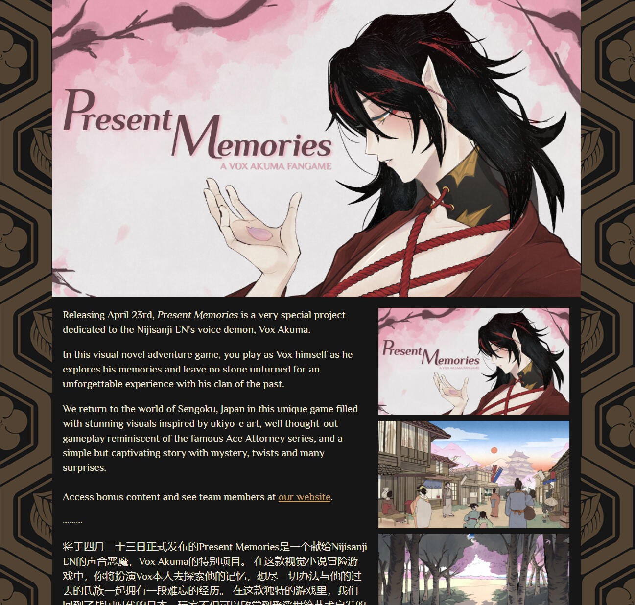 Present Memories is a very special project dedicated to the Nijisanji EN's voice demon, Vox Akuma.In this visual novel adventure game, you play as Vox himself as he explores his memories and leave no stone unturned for an unforgettable experience with his clan of the past.We return to the world of Sengoku, Japan in this unique game filled with stunning visuals inspired by ukiyo-e art, well thought-out gameplay reminiscent of the famous Ace Attorney series, and a simple but captivating story with mystery, twists and many surprises.